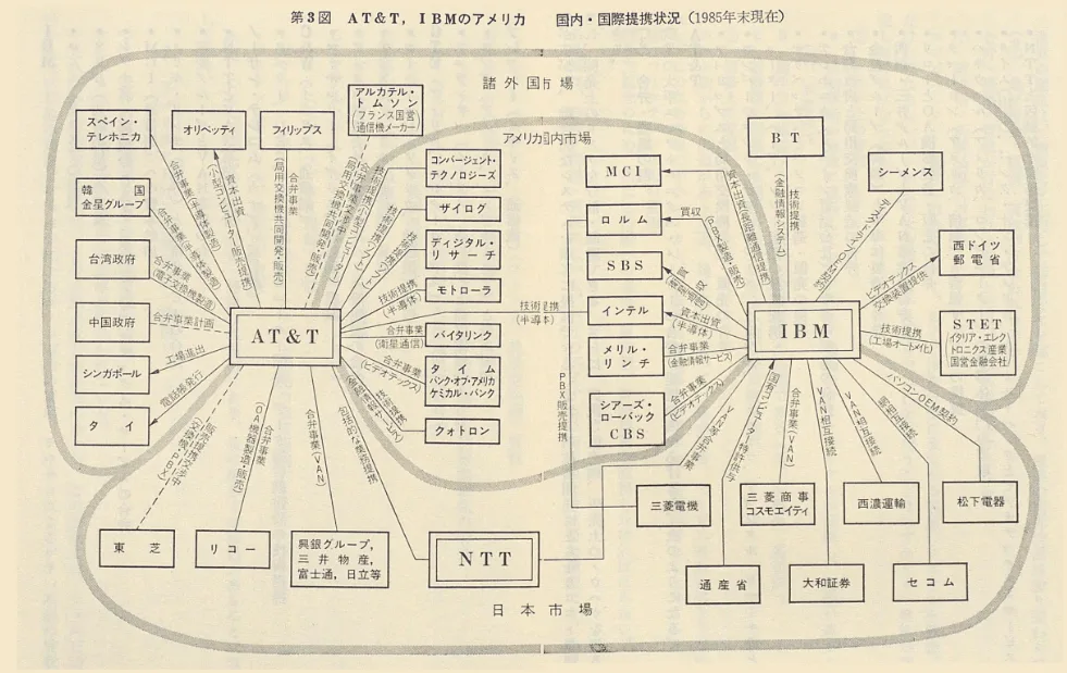 下図は、第19章「巨人の終焉(p.393)」に関連して、1985年当時の情報産業界の業界地図を表したものです(関秀夫『AT&Tの地球戦略: 急展開する世界情報通信産業』、ダイアモンド社より;この本は国立国会図書館の個人送信サービスで閲覧できます)。